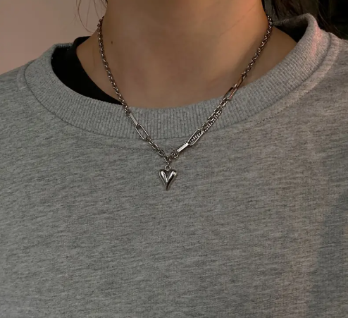 T❷❻🦋Collar con Colgante de Corazón Chic Hip-Hop Rock para Mujeres - Acero de Titanio, Bañado en Oro Blanco, Cadena de Clavícula Moderna y Elegante