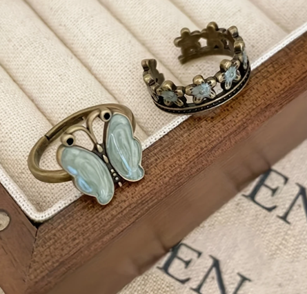T❹❺🦋Par de Anillos para Mujer con Diseño Vintage de Mariposa y Flor Abierta en la Espalda