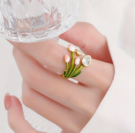 T❹❺🦋Anillo de Esmalte Ajustable con Tulipán y Hoja para Mujer - Diseño Floral Dorado