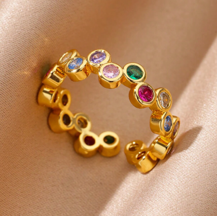 T❹❶💐1 pieza Anillo redondo de circonia arcoíris para mujer, anillo de ojo malvado de acero inoxidable de color dorado