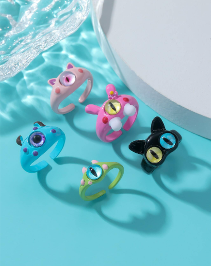 ❶❹⭐Anillos negro ojos de gato de colores monstruo de dibujos animados