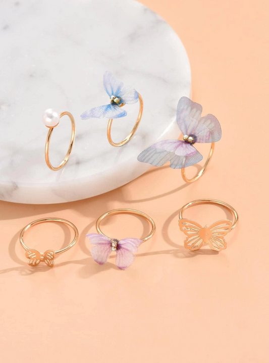 💚🌸6 Piezas/decorativos De Moda Anillo De Imitación De Perla Y Mariposa.