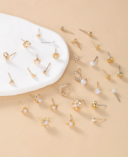 ❸❷🍁Set de regalo de 30 pares de pendientes tipo botón de lujo y elegantes con flores, corazones y mariposas de metal, perlas falsas y rhinestones para mujeres