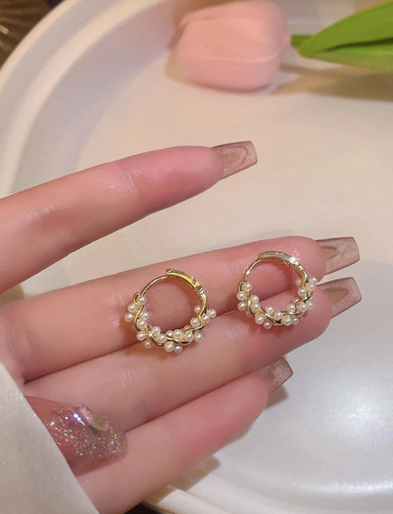 ❶❾☘️1 Par De Aretes De Círculos Lujosos De Aleación De Cobre Y Perlas Sintéticas Para Mujeres