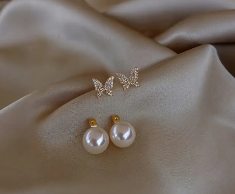 T❸❸💫Elegantes Pendientes de Mariposa y Perla Falsa con Brillantes de Estrás