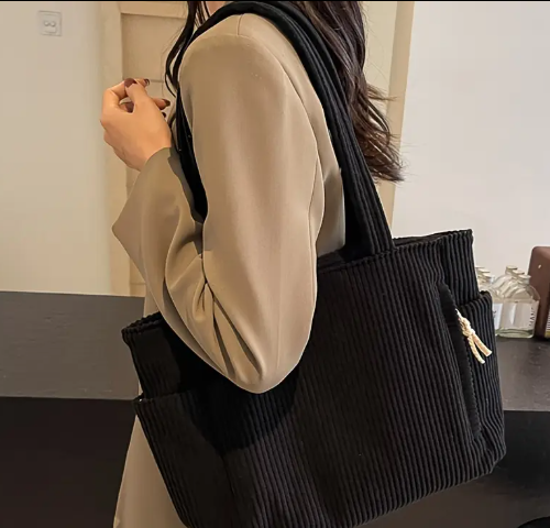T❹❶💐1pc Bolso Tote de Pana Elegante y Casual con Cierre de Cremallera, Gran Capacidad Plegable Forrado en Poliéster