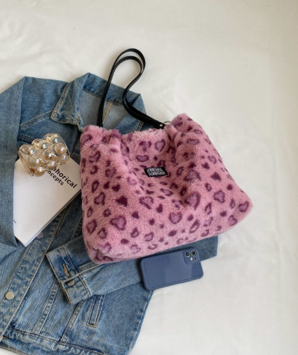 ❸❶🌸Bolso de tote de peluche suave, acolchado, esponjoso, mullido y peludo de 1 pieza con estampado de leopardo rosa, con decoración de anillo metálico y gran capacidad para uso diario de mujeres, niñas, estudiantes universitarias