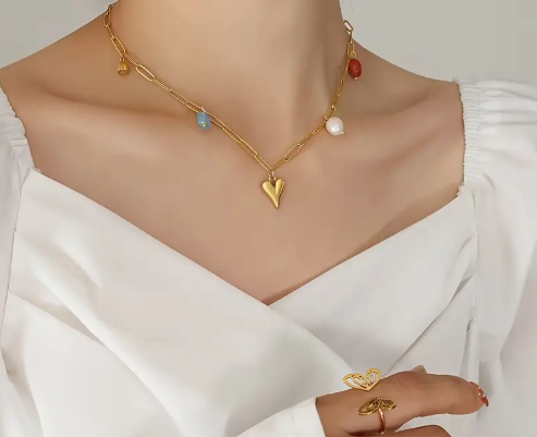 T❹❻🌹Collar de acero inoxidable de Bohemia Cadena de capa doble con dije de corazón