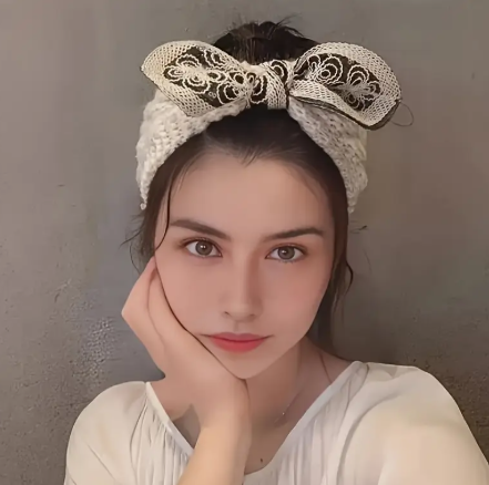T❹❾💥 Diadema Elegante de Punto Floral en Crema y Negro con Lazo