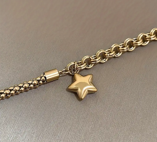 T❷❾🏵️ Pulsera de cadena gruesa de acero inoxidable con colgante de estrella de estrás - Joyería de muñeca de moda para bodas