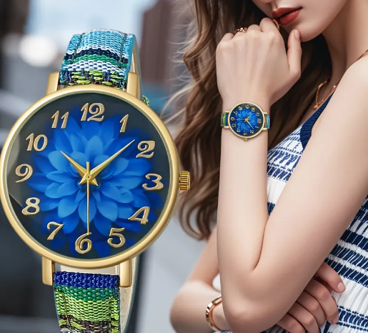 T ❸❹🌻 Reloj de Cuarzo para Mujer [Estilo Elegante] Boho Chic - Estilo Vintage con Esfera Floral Azul, Caja Dorada y Correa de Cuero PU Tejido, Regalo Perfecto para el Día de San Valentín