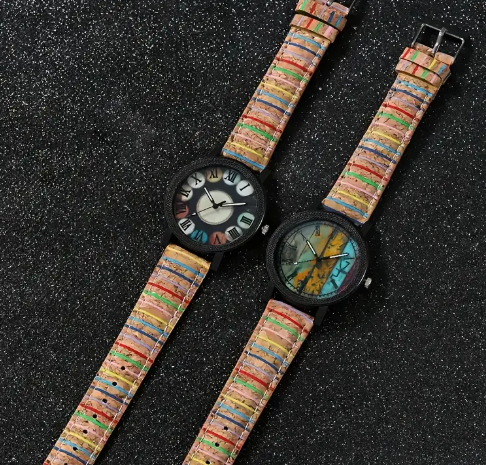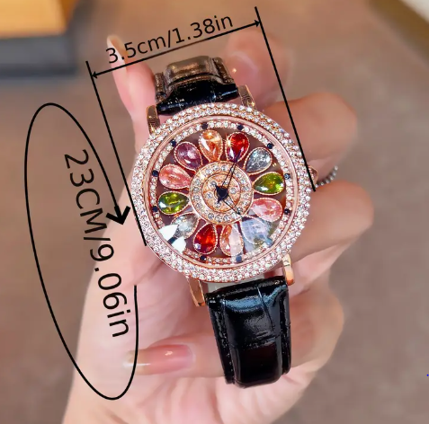 T ❸❹🌻 Reloj de pulsera de cuarzo de moda para mujer con coloridos adornos de diamantes de imitación, esfera giratoria, caja de aleación y correa de cuero PU duradera - No resistente al agua