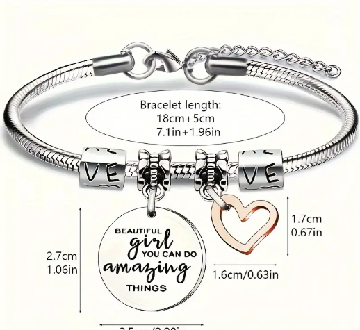 T❸❷🍁1pieza Pulsera de acero inoxidable inspiradora, "Hermosa niña, puedes hacer cualquier cosa" Grabada con dije de corazón, joyería diaria