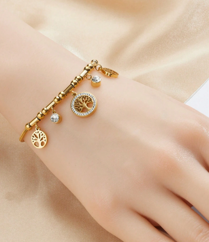 ❸❶🌸1 pieza Pulsera de cadena de acero inoxidable con colgante redondo del árbol de la vida incrustado de rhinestones, diseño de moda y versátil apto para uso diario