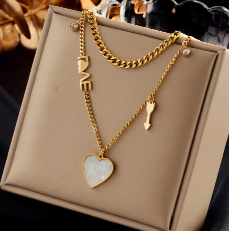 T❺❸💫Elegante collar de acero inoxidable de capas múltiples con colgante de corazón